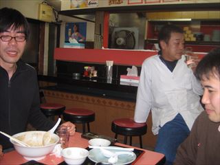 中に入ると先客は誰もいない。メニューも怪しく、チャーハンはなぜか大と中があり、どっちも700円と書いてあった。(良心的)お薦めは坦々麺らしくメニューに「かなり時間が掛かります」や「チャーハンと一緒に頼むとかなり時間がかかり誠に申し分けないです(漢字を間違えている。分と訳)」等親切に書いてあった。ガッチャは時間かかるらしいお薦めの激辛坦々麺(900円)を頼み、ジンケはチャーハンの大(大と中どっちも700円)、クラチョンはラーメン(600円)、自分は海藻ラーメン(450円)を頼んだ。店のご主人は関西人らしく、久々の個性的なキャラでガッチャと息が合っていた。ガッチャが半熟煮卵(100円)を気になったが、店のご主人が今日仕込むのをうっかり忘れてないらしい・・・。