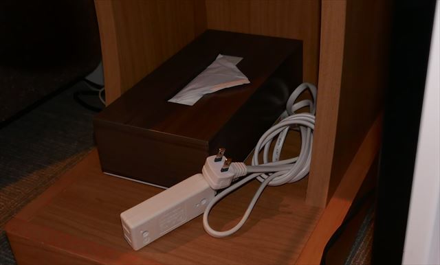 枕元には、冷蔵庫・電気ケトル・電気スタンド・お茶セット・目覚まし時計。枕元に冷蔵庫があるのは便利。目覚まし時計もあると嬉しい。