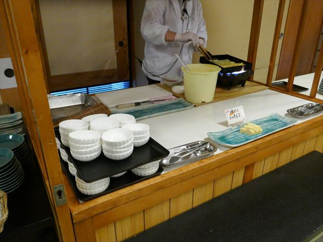 会場前でスタッフの方に客室の番号を伝え受付をし、スリッパを脱ぎ、指定席まで案内された。後日宿泊したが団体客がいなければ席は自由席になっている。利用法は指定された席に食事中の札が置いてあり食べ終わったらひっくり返す