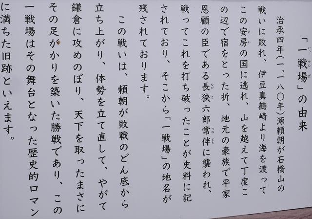 魚見塚一戦場公園の一戦場の由来は、1,180年に源頼朝が石橋山の戦いに破れ、伊豆から海を渡って安房の国(現在の千葉県南部)に逃れ、丁度この辺りで宿をとった折、地元の豪族で平家恩顧の長狭六郎常伴に襲われ、戦ってこれを打ち破ったことが試料記されてることから「一戦場」の地名が残された